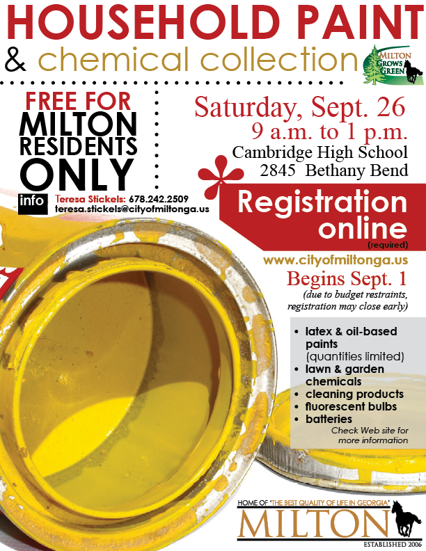 Online pre-registration is still open for Milton's fourth household paint and chemical collection event, to be held from 9 a.m. to 1 p.m. Saturday, Sept. 26 at Cambridge High School thanks to Milton Grows Green.