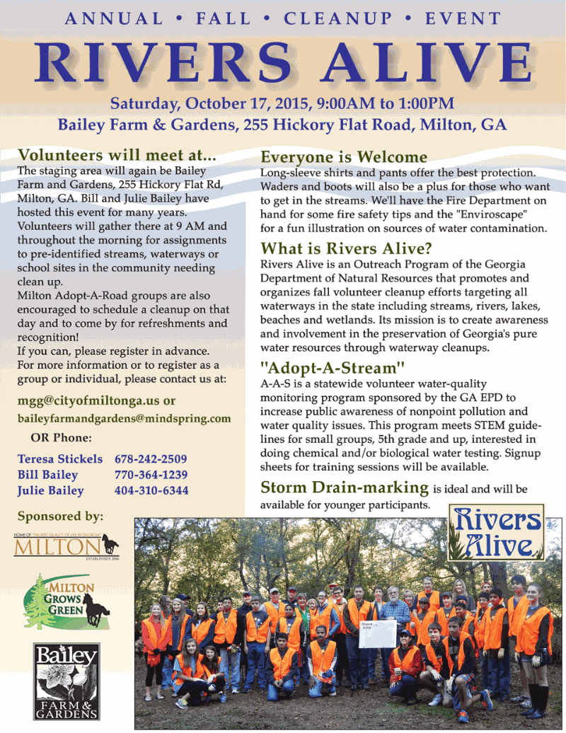 The Milton Grows Green Committee (MGG) is co-sponsoring the event with Bailey Farm & Gardens, Inc., which has been involved with the project for 18 years. Rivers Alive 2015 will kick off from its traditional location at Bailey Farm & Gardens, 255 Hickory Flat Road, one mile west of the Birmingham Crossroads.