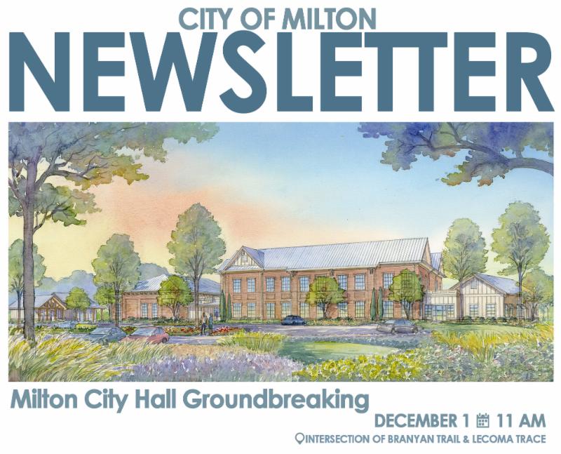 Over the course of our almost nine year history we have done some amazing things as a community. Join us Tuesday, Dec. 1 (our ninth birthday) at 11 a.m., as we make Milton history by breaking ground on our new City Hall. The new City Hall complex will include offices, council chambers, meeting areas for residents and a town green for community events, all in downtown Crabapple. On top of this momentous event, we have a packed month ahead with holiday festivities around town. We hope you and your family will join us for three great holiday events this year: the Milton Tree Lighting Saturday, Nov. 28; the eighth annual Christmas in Crabapple Saturday, Dec. 5 in partnership with the Crabapple Community Association (CCA); and the second annual Pancake Breakfast with Santa Claus hosted by the Milton Fire Department Saturday, Dec. 12 ...