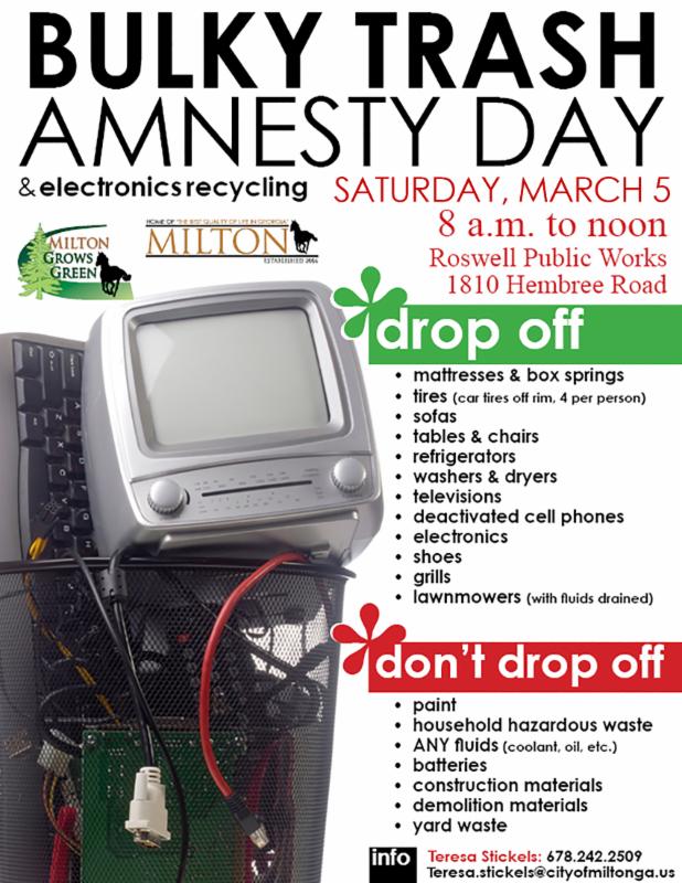The City of Milton Public Works Department and Milton Grows Green are offering residents a bulky trash amnesty day Saturday, March 5, so gather your large items for disposal.