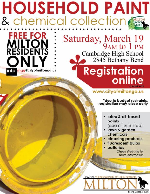 Online pre-registration is now available for Milton's household paint and chemical collection event, to be held from 9 a.m. to 1 p.m. Saturday, March 19 at Cambridge High School thanks to Milton Grows Green.