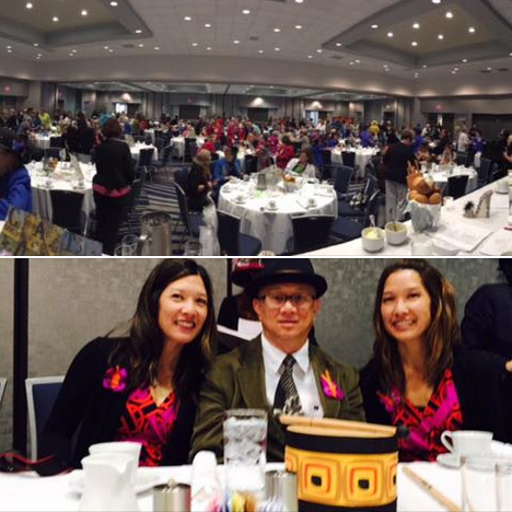 Top: California State BSP Convention Hall. Below: LFNC Executive Director Rene Astudillo (middle) and Board members Kirsten Gee Maeda and Deidre Gee Baptista pose for a photo with our theme: Drumbeat for a Lupus Cure.