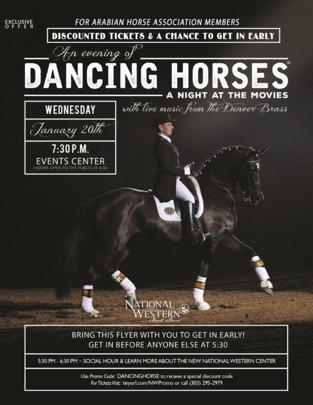 Exclusively, for our Arabian Horse Association members, a discount for the great event, An Evening of Dancing Horses at the National Western Stock Show in Denver, Colorado, and a chance to get into the event early. Please join the festivities at 5:30 p.m. on Wednesday, January 20 in the Events Center to enjoy time with friends and witness beautiful and talented horses in front of live music from the Denver Brass. The event will feature Reining, Western and English dressage, liberty and more. We look forward to seeing you there!