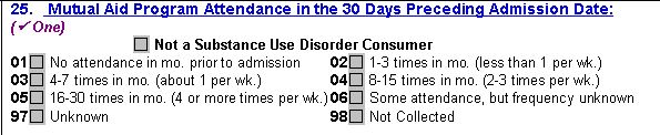 A question was added to gather data on Mutual Aid Program Attendance (the number of times the client has attended a self-help program in the 30 days preceding the date of admission/discharge from treatment services).
