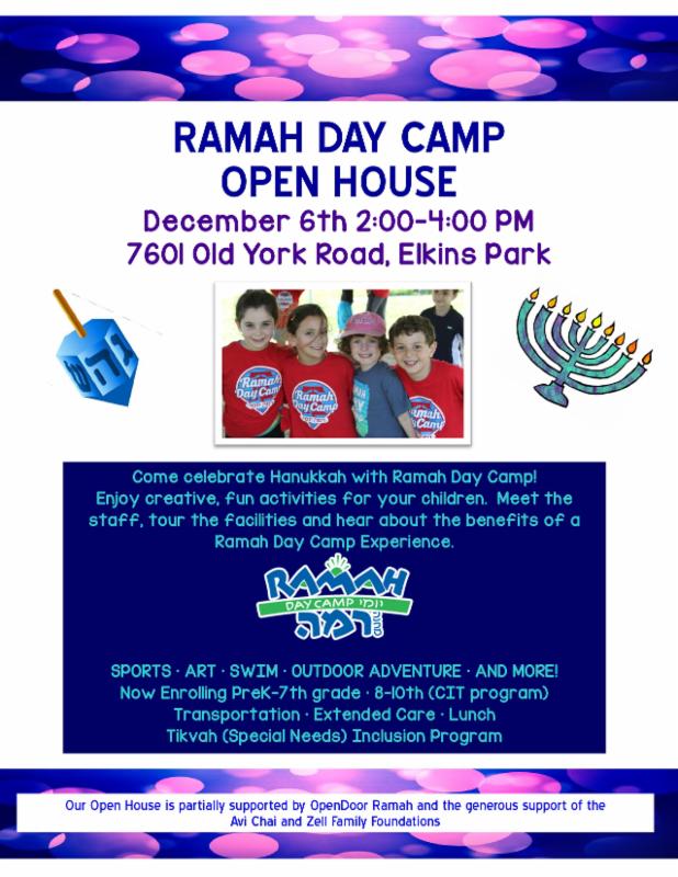As you light the Hanukkiah, eat latkes and sufganiyot (jelly doughnuts) and enjoy your family, remember the wonder of the summer your children spent with Ramah Day Camp. Your children feel the magic of Ramah not only in the summer, but, all year long. We miss our Ramah family during this festive holiday and we want to keep the feeling of community going during the winter season. Please share our first open house of the season with your friends and family. They can join us on Sunday, December 6th to celebrate Hanukkah with us. We will make s'mores, enjoy fun and creative activities and play dreidel. You should also put Sunday, January 24th, on your calendar for our Ramah Day Camp reunion. Meet us at the Sports Zone in Southampton, PA from 4- 6pm for an evening filled with fun and friends. I hope that you and your family have a wonderful holiday.