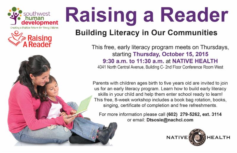 Raise a Reader - Thursday, October 15 - 9:30 a.m. NATIVE HEALTH Central. Class sponsored by Southwest Human Development.