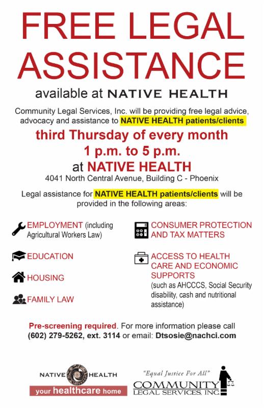 NATIVE HEALTH partners with Community Legal Services for a Medical/Legal Partnership. Individuals must be registered patients/clients of NATIVE HEALTH. The next service date will be October 15. For information or to make an appointment please call (602) 279-5262 x 3114 or email Diane.