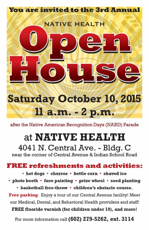 NATIVE HEALTH is proud to present the NATIVE HEALTH Children's Pageant on Saturday, October 3, 10:00 a.m. at MetroCenter Mall. I hope you attend this fun, family event. This will be a cool, free way to spend time with your family and enjoy the babies traditional dress and the older kid's perform. Please see the article below for additional information. NATIVE HEALTH will host its 3rd Annual Open House on Saturday, October 10, immediately following the Native American Connections Parade. There will be free food, free photo booth, bouncy activities, free face painting, free flu shots (with Tribal ID) and much more. Come by and join the fun! NATIVE HEALTH and the local Native American community have many exciting events planned for Native American Recognition Days (NARD) beginning in September. Click here to view the 2015 NARD Events Card.