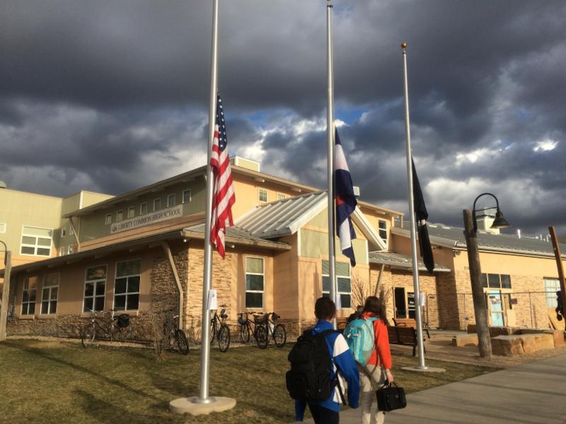 Marine veteran Mr. Tom Buchanan of Loveland, Colorado donated classroom Flags for every classroom at Liberty Common High School. He was on hand to celebrate our school's first Torch Trek, which was the day the Flags were first posted in our classrooms. Mr. Buchanan died last Friday. The Flags over LCHS fly this week at half-staff in honor of his service to our country, for his heroic patriotism, and for his generosity to our school. May he rest in peace.