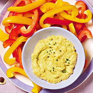 Puree 1/4 avocado, 2 tablespoons store-bought hummus, and 1/2 teaspoon lemon juice in a food processor. Stir in 1 teaspoon chopped fresh chives. Serve as a dip with 1 sliced red or yellow bell pepper.