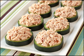 Here's another super simple idea. Top 10 round cucumber slices with 3 ounces of water-packed tuna for a protein-packed, crunchy snack.