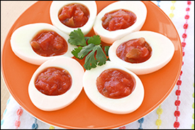 Simply hard boil 3 eggs, slice in half, and remove the yolks. Chill if needed. Place 1 tsp. salsa (see our recipe below or use store bought) in each half and enjoy.