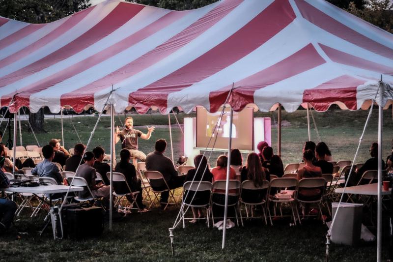 | Pastor Jeff Tatarchuk speaks to students on the campus of Indiana University during a CRAVE evangelistic initiative.
