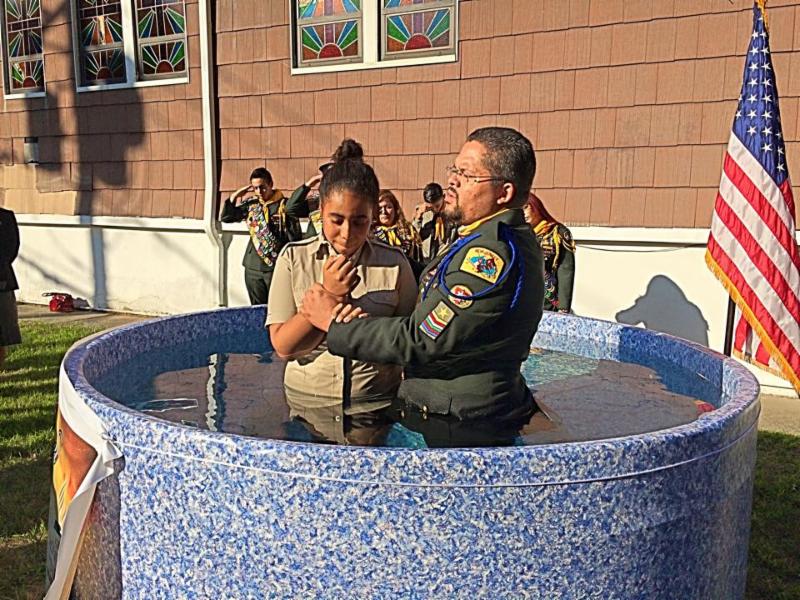 Pastor Elvis Díaz baptizes a Pathfinder during World Pathfinder Day at the Maranatha Spanish Church in Union City, New Jersey.