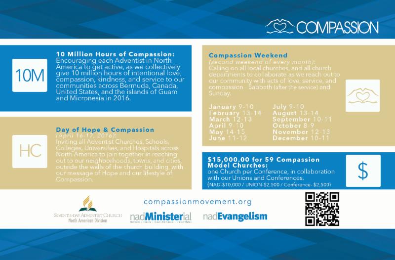 The Day of Hope & Compassion will serve as a very festive two-day Division-wide commemoration of our hope. Our President, Pastor Dan Jackson, envisions all Adventist Congregations, K-12 Schools, Colleges, Universities, and Hospital in North America celebrating our hope through acts of compassion, a social media blitz, joyful worship services, and distribution of inspiring Adventist literature that is practical to the daily lives and needs of our communities. This celebration will provide an opportunity for grand collaboration among church members, church ministries, and institutions. Please, mark your calendars, we need total involvement to make it a reality.