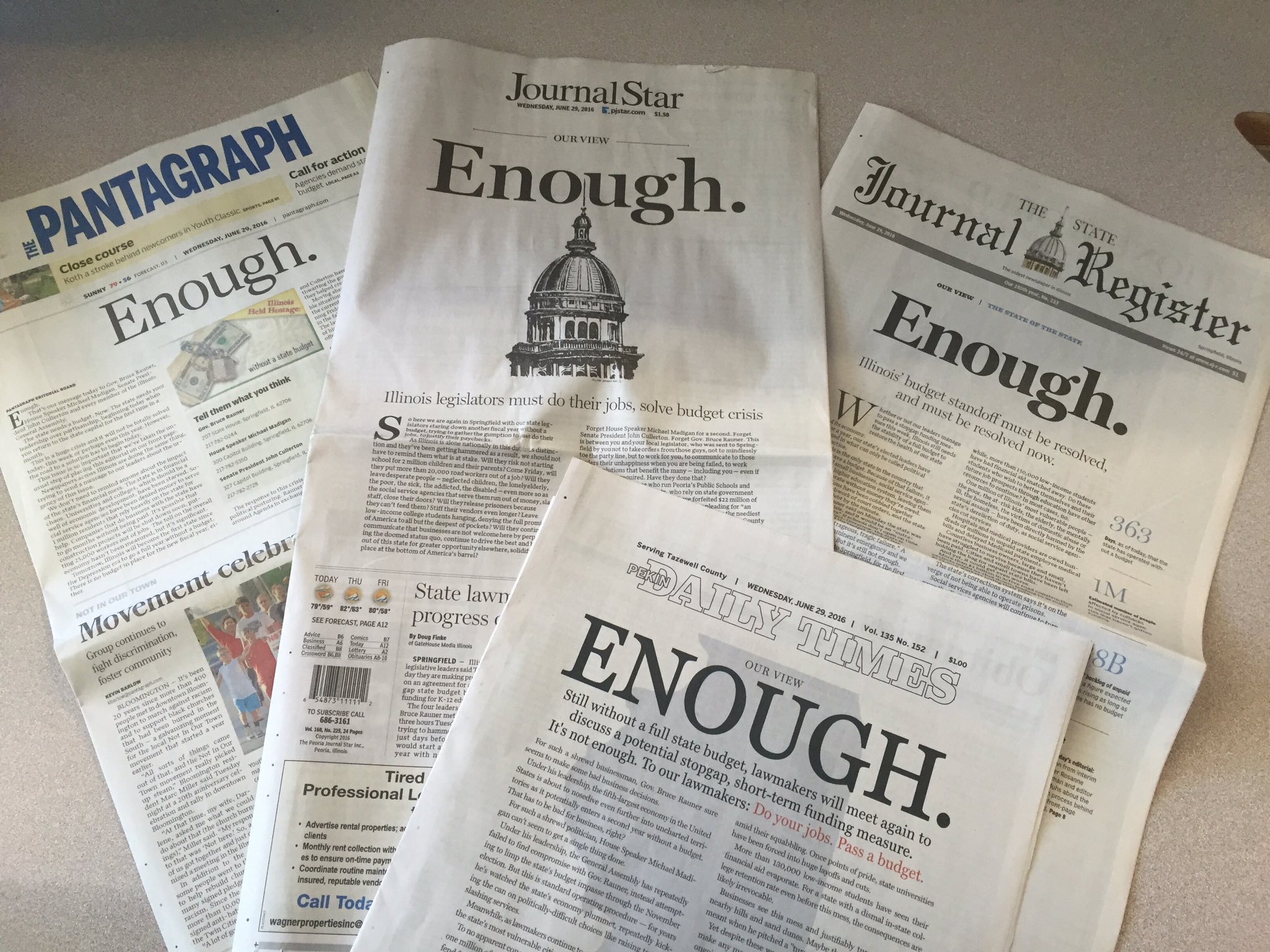 Illinois's financial crisis and two-year budget impasse has come to a head and newspapers in the state have banded together to send a message to government officials.