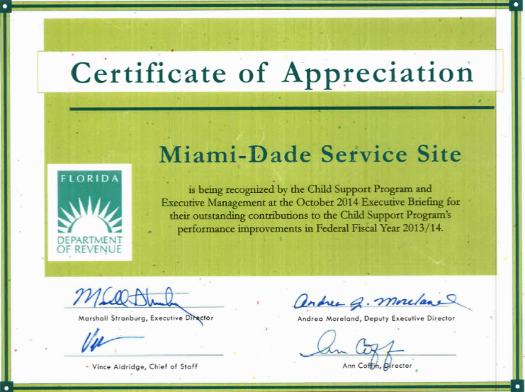 As has been the case for many years, the Miami-Dade CSED once again ranked first in the state for collecting the highest percentage of on-going child support monies owed. The Miami-Dade CSED also ranked first in the state for having the highest percentage of cases receiving payments towards past-due arrears. During the Federal Fiscal Year (FFY) 2013/14, the office collected and disbursed over $178 million dollars to families.
