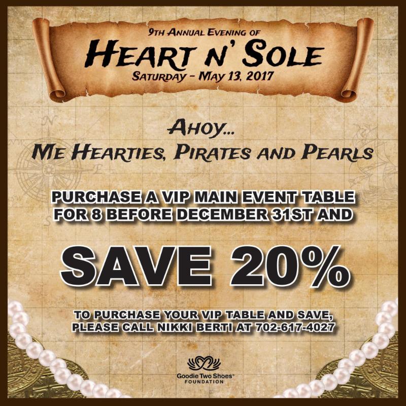 Ahoy... Me Hearties, Pirates & Pearls, it's time to weigh anchor and chart your course for GTSF's 2017 Heart n' Sole event! Purchase your VIP table for 8 before December 31st, and SAVE 20%!