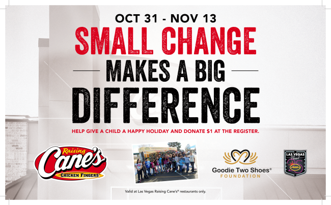 From October 31st through November 13th, Raising Cane's Chicken Fingers will be collecting $1 donations at the register to provide hundreds of children with new shoes and socks through GTSF! All 11 Las Vegas locations are participating to help a child have a happy holiday. Drop in and make a difference! @vegascaniac