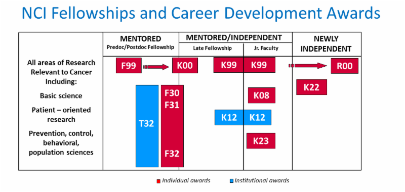 At the NIH and NCI, there are dedicated training grant mechanisms that support individuals at a variety of educational levels and career stages, ranging from mentored predoctoral training grants to awards for late-stage graduate students and postdoctoral fellows that help them to transition into their next career stages. NCI also has career development awards for individuals with a Ph.D., M.D., or other research or professional doctorate degree who are committed to careers in all fields of cancer research including cancer prevention, control, behavioral, or population sciences. There are also NCI training funding mechanisms that support institutional training and education grants to develop or enhance research training opportunities for pre- and post-doctoral fellows. Many of these awards are managed by NCI's Center for Cancer Training.