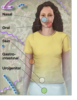 Anatomical diagram of the five major body sites: nasal, oral, skin, gastrointestinal, and urogenital