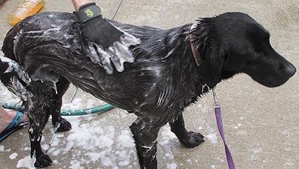 Yadda-yadda-yadda" I thought, ANY kind of brushing with any tool does that; it sounded like just another bit of hype to promote this new product. Imagine my surprise, however, when after just a few strokes with the gloves, along with the expected amount of hair, I also began seeing a shocking amount of dandruff! I have owned this dog for years, and her coat is ALWAYS shiny; no hint of dandruff, so she is living proof that these gloves really DO achieve results that other tools do not. This day was also bath day, so next the gloves were put to the test with soap and water added:  How wonderful it is to be able to scrub with both hands Bailey only gets a few baths a year, so she's always a little concerned about what is going on. Since we were in the middle of the driveway, I needed to be able to grab her leash quickly in case she decided to leave the scene. The gloves let me do that with ease. A luxury you don't have with regular grooming mitts.