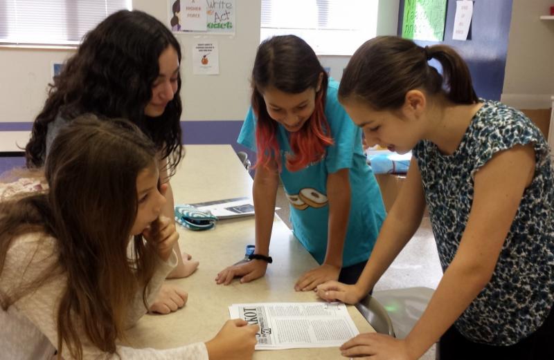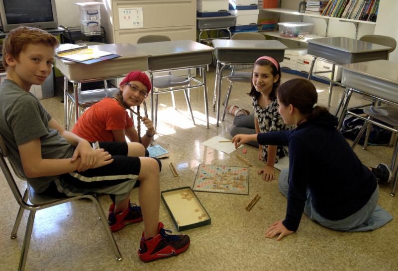 | | 7/8th graders in Mrs. Kahana's class play Hebrew Scrabble for fun. |