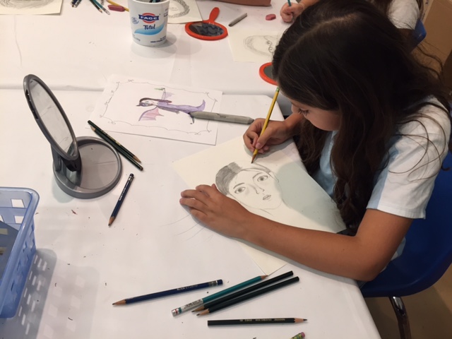 | | Middle Schoolers (here Ava) studied line, shape, and shade in the mirror and used drawing pencils to carefully draw self-portraits which are now on view in the grade school main hallway. |