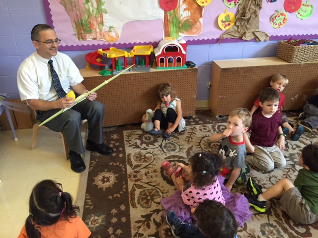 | | Rabbi Holman visited the Purple Room again, this time to share the Lulav and Etrog with the children in time for Sukkot. |