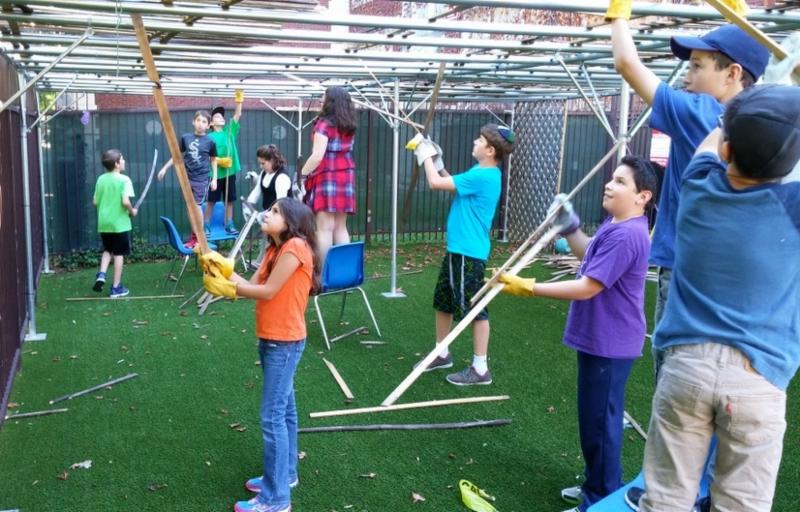 Our school's Sukkah, too, is the physical manifestation of this concept. Ron and Jefferson, our school superheros, built the structure for the Sukkah. Students helped decorate the Sukkah and cover it with Schach. Our neighbors at Congregation Rodfei Zedek will use it on the holidays when we're not in session, and preschool students will come together with 7th/8th graders to learn about the holiday. The Sukkah, like the school, is the physical institution that builds community.