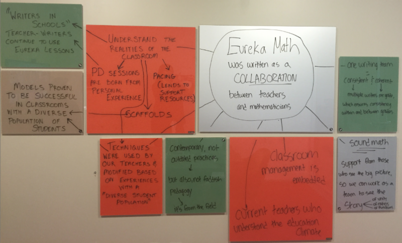 At a recent retreat, the Eureka Math team was asked, "What distinguishes Eureka from other math curricula?" Instead of responding aloud, Director of Mathematics Jill Diniz asked our teacher-writers to write their ideas on chart paper throughout the room. They wrote: it is consistent and coherent; it was written as a collaboration between teachers and mathematicians; it maintains a balance of rigor; it is intentional and deliberate. This "Silent Conversation" was designed ensure an equality of voice among our diverse team of PK-12 educators. Find out what they wrote and discussed, and make your own comments, by clicking here.