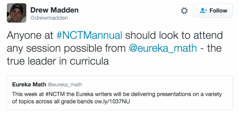 This week, the Great Minds team will be attending the annual meeting and conference of the National Council of Teachers of Mathematics in San Francisco. The expo is open this week from Thursday through Saturday. Here's what people are already saying: Last year's demonstrations were so successful because we hosted actual students learning Eureka Math in real time, and it made our booth the most-visited in the entire conference. This year we will be joined by: