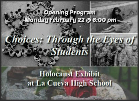 The exhibit consists of 21 panels detailing the experience of teenagers and young adults during the Holocaust, and the difficult choices they faced that had everlasting effects on humanity. The content of the panels has been created by a recently deceased Holocaust survivor who faced difficult decisions and experiences during the Holocaust. To celebrate the opening of this touching exhibit, students at La Cueva High School in the UNESCO Club and Safe School Alliance programs have come together to host an opening event on Monday, February 22nd at 6:00 pm. At this opening of the exhibit, we will meet a Holocaust survivor, and hear his story of the tragedy. The award winning La Cueva High School Orchestra program will play following the opening event. Link to Flyer