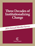 The 2014 Annual Membership Survey, "Three Decades of Institutionalizing Change," tells a story of continued growth in support structures for campus engagement, leading to notable levels of engagement with students, faculty, and community partners.