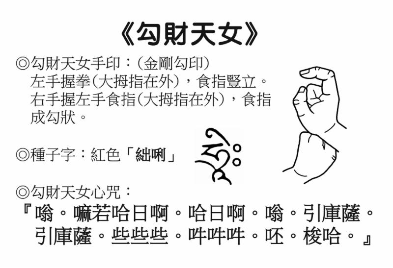 【蓮生活佛 盧勝彥法王寶貴法語開示--勾財天女的偉大來歷及修法口訣】 「勾財天女」即密教之「勾攝財續母」,「母」字的範圍很廣,代表著女性,也就是「女」的意思,所以「天母」也就是天女的意思。