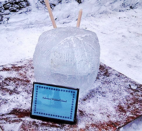 | Plus:Chris McBride for help with ideas and prep, and Cooper McBride for his enthusiastic support of this project. Jessica and Gabe Wheeler for showing up early to take pictures. Michele and Soren Beckstrom and Susan Junge, for stopping by afterward to admire our work.Want to do this again next year? How about 6th- grade geometric forms, a pair of cross-country skis, or maybe a gigantic lantern?Warmest thanks,Beverly Scott Ashwood's Ice Carving Team Captain, 2015