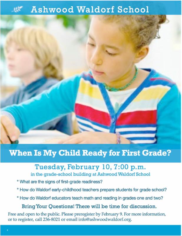On February 10 at 7:00 p.m., you are invited to "An Introduction to First Grade," a presentation and discussion with Ashwood faculty about what to expect when your child enters first grade. We hope that you will be able to join us for this informative meeting.