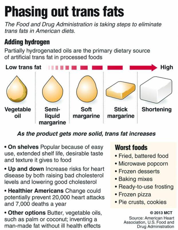 | | FDA Orders Food Manufacturers to Phase Out Trans Fats Within 3 Years: Eating a diet rich in trans fat is linked to higher body weight, heart disease and memory loss. It has been shown to raise the "bad," or LDL, cholesterol in the blood, which can lead to cardiovascular disease. CNN, June 16.