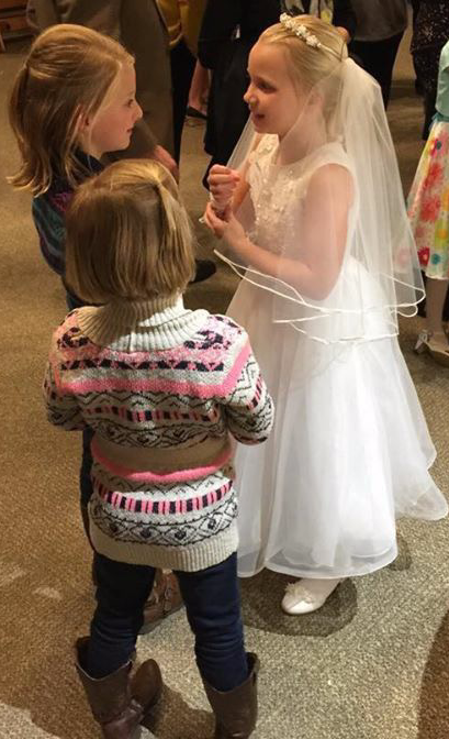 Our newly-baptized, Madeline Herold (pictured below with Kaylin and Mara Gruber), who also celebrated the sacrament of Confirmation and joined us at the table of the Eucharist. - Photo courtesy of Melissa Gruber