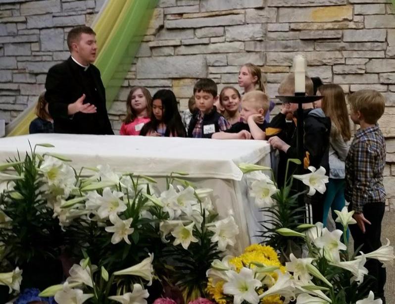 On April 9 and 16, we will be celebrating our second graders receiving the Sacrament of Holy Eucharist for the first time. These children have been preparing with Kevin Scroggins, Coordinator of First Eucharist and Reconciliation and Brenda McClennan, Elementary and Family Faith Coordinator. We welcome them with joy and pray that they will always experience strength and nourishment as they are joined with Jesus in Holy Communion. The photo below shows Fr. Stiles preparing the children at a recent First Eucharist retreat: