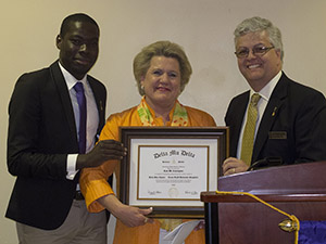 | (Left to right) The Delta Beta Chapter of Delta Mu Delta President François Brou, newly inducted Honorary Member Ricki Cunningham and Delta Mu Delta Faculty Advisor and Dr. Jesus Carmona