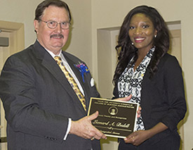 Distinguished Alumnus Leonard Bedell receives his plaque from student Chelsea Williams.