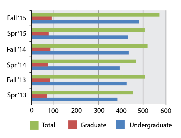 For the second consecutive semester, the College of Business of Administration has experienced a double-digit increase in enrollment. Figures show 569 students enrolled for the fall semester, a 10 percent increase over last year, according to university enrollment reports. There are 481 undergraduate students and 88 graduate students attending classes in the college this fall. Read more about this article.