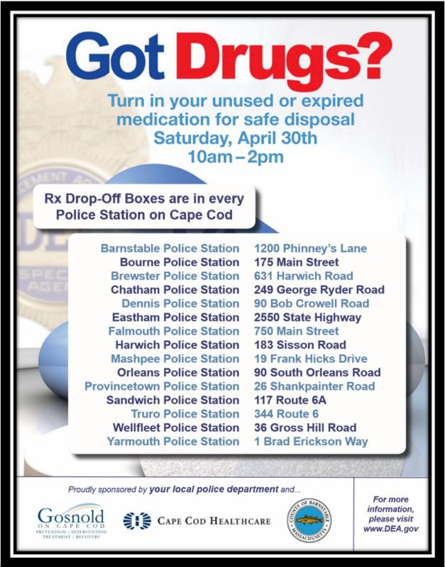 April 30th provides a safe, convenient, and responsible means of disposing prescription drugs, while educating the public about the potential for abuse of medications and the importance of protecting the Cape's natural environment. So drop off your unwanted or unused medications at any Cape Cod Police Department on Saturday, April 30th. No paperwork to fill out, no questions asked.