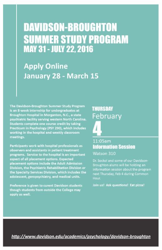 Interested prospective applicants should begin dialogue with a prospective psychology faculty mentor immediately. A reminder that while proposals are judged on merits of research ideas, quality of expression, feasibility of the proposed work, and mentoring relationship with a faculty member, the proposal is not intended to be highly labor intensive; hence the two-page format. Submit your proposals electronically to Dr. Smith (masmith@davidson.edu) in the Psychology Department Office by 5:00 PM on Monday, March 21.