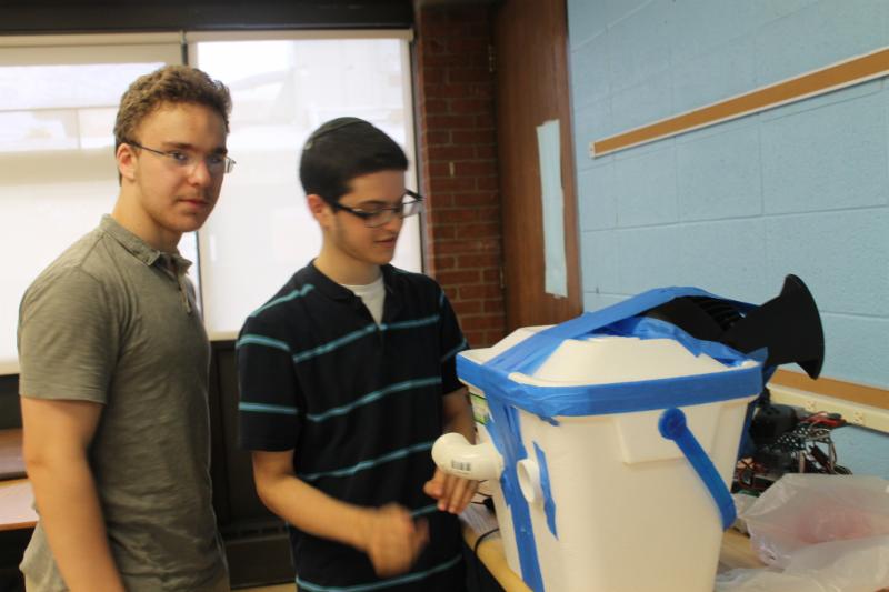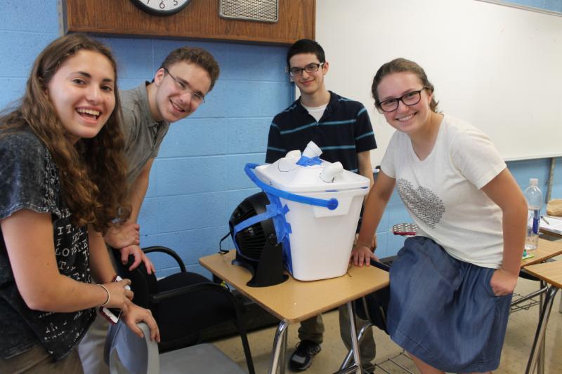 Dr. Stewart's 11th grade physics students made classroom air conditioners using insulated coolers, fans, ice, and PVC piping.