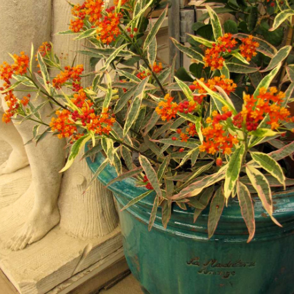 Hort Couture's Jennifer Hatalski and jim Monroe gave us these details: This special ascelpias has beautiful green and white variegated foliage that is tinged with red, orange and pink tips of of the leaves. The bright orange-red flowers attract Monarch butterflies as well as other species of butterflies, bees and hummingbirds. It can be used in the landscape or in container gardens. Hardy to Zone 10-11.