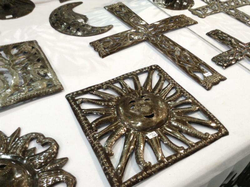 |  Le Primitif Galleries Barrel Art from Haiti David McCabe told us they began working with artists in Haiti in 1976 to import the finest quality, recycled steel oil drum sculptures. Because each piece is hand-chiseled, each piece is an original work of art. The designs are chalked out on flattened steel oil drums and then cut out with a mallet and chisel. These works grace such prestigious institutions as the Museums of Modern Art in Paris and New York. This beautiful, hand-chiseled wall hanging was crafted in Haiti from recycled steel oil drums and can be displayed inside or outside to elevate the decor . Website: http://www.leprimitifgalleries.com | |