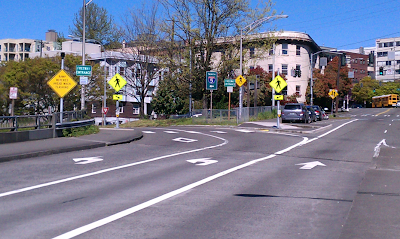 Want to learn more about the cool new left turn bike boxes like the one in the Cherry Hill bike lane project? Watch SDOT's video about how to use them and for even more information, check out this National Association of City Transportation Officials article on what they call "Two-Stage Turn Queue Boxes."
