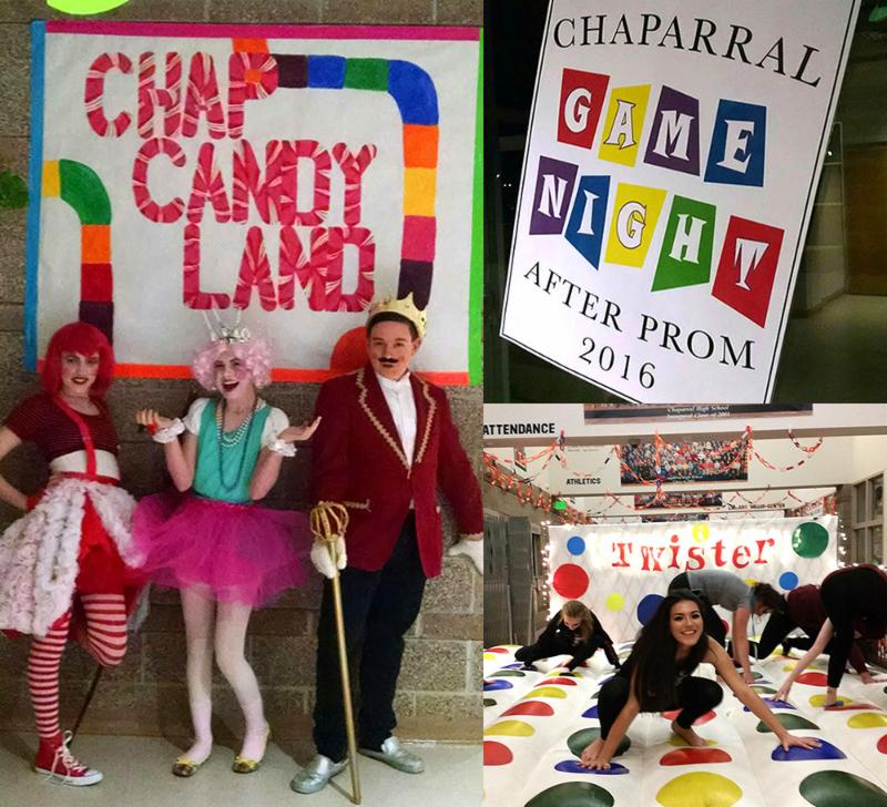 With the goal of keeping kids off the road and extending the magic of a special night, over 150 parent volunteers worked countless hours to create an entertainment extravaganza that started at 11:30 p.m. on prom night and ended at 3 a.m. It was fun...safe...and alcohol free! This year the 'After Prom' theme was "Game Night" and Chaparral High School was transformed with elaborate decorations, food, games and activities for over 625 students! |
